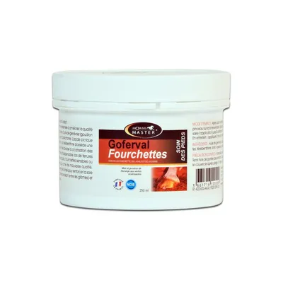 GOFERVAL FOURCHETTE - HORSE MASTER est un soin à base de miel, dhuile de Genévrier, de soufre, de térébenthine et d'acide picrique pour fourchettes et sabots des chevaux.