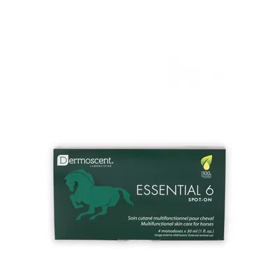 ESSENTIAL 6 CHEVAL - DERMOSCENT est un soin monodose en pipette pour cheval qui apporte une solution prouvée aux troubles cutanés et à leurs conséquences : pellicules, poils secs/ternes/cassants, robe du cheval grasse, perte excessive de poils et déséquilibre de la microflore cutanée.
