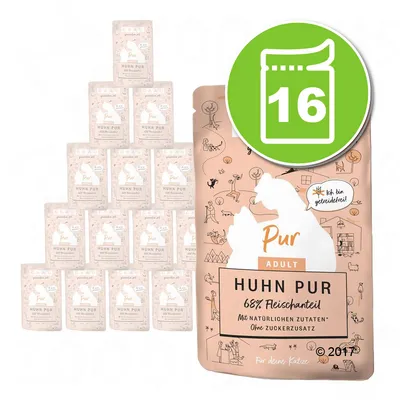Nourriture humide équilibrée pour chat, riche en viande et abats, sans céréales, sans protéine de soja, sucre ajouté ni OGM, en sachets fraîcheur pratiques, produite en Allemagne