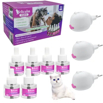 Le Pack TOP AFFAIRE Felicalm réunit 3 diffuseurs intelligents et sécurisés ainsi que 6 recharges de phéromones apaisantes félines, soit 6 mois de tranquillité pour votre chat et toute la maison.