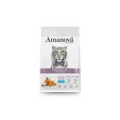 Les croquettes Amanova chat stérilisé poisson sont un aliment complet à faible teneur en céréales, spécialement conçu pour répondre aux besoins des chats stérilisés à partir de 12 mois. Préparée exclusivement à partir de poissons blancs frais comme seule source animale, cette recette hypoallergénique fournit des protéines de haute qualité et une excellente digestibilité. Naturellement riche en acides gras oméga-3 et oméga-6, elle contribue à la santé cardiovasculaire, à une peau saine et à un pelage brillant. L'ajout de L-carnitine aide à métaboliser les graisses et à maintenir un poids de forme après la stérilisation. Des fibres fonctionnelles, des prébiotiques, des huiles végétales et marines ainsi que des ingrédients comme le gingembre et la citrouille soutiennent la digestion, la fonction rénale et aident à prévenir la formation de boules de poils.
