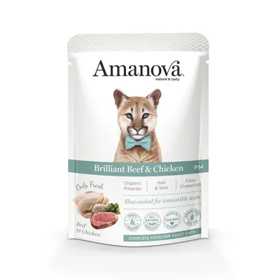Cette pâtée pour chat sans céréales au poulet et bœuf Amanova propose une recette riche en ingrédients d'origine animale, parfaitement adaptée aux besoins des chats adultes. A