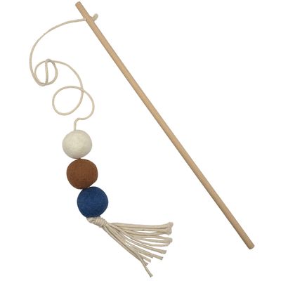 Comme son nom l’indique, la canne à pêche pour chats est une longue tige qui se tient à la main. Elle est munie d’une ficelle, ou d’une cordelette, attachée au bout. À l’extrémité de la corde, à la place de l’hameçon, un jouet qui sert à appâter les minous. Pour jouer avec votre compagnon vous pouvez :