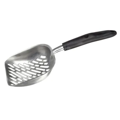 Pelle à litière Zora en aluminium inoxydable, grande surface pour un nettoyage rapide, poignée ergonomique avec système de suspension, durable et facile à utiliser.
