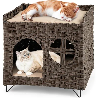 GIANTEX Niche Chat en Rotin à 2 Niveaux avec Grotte Cachée