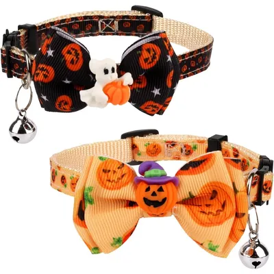 🌟 Décoration élégante : Les deux impressions différentes (citrouilles et fantômes) sont super intéressantes et attrayantes. 😍 Le design mignon de citrouille - fantôme est comme un petit sortilège qui peut rendre votre chat encore plus charmant. 🌟 Les cloches sur le collier émettent un son mélodieux. 🔔