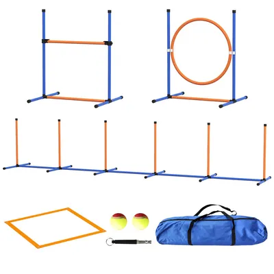 Dim. haie : 73L x 66l x 92H cm - Dim. slalom : 352L x 66l x 69H cm - Dim. zone de repos : 88L x 88l cm. Equipement complet d'entraînement (4 pèces) pour chiens. Idéal pour utiliser sur l'herbe ou sur n'importe quel terrain plat. Adapté à l'évolution des capacités grâce à des anneaux de 8 à 55 cm de hauteur et des haies de 8 à 88 cm réglables grâce à un piquet de terre. Les balles de tennis sont motivantes et un sifflet guide les chiens sautillants à travers les parcours. Emmenez l'ensemble d'agilité partout où vous allez avec facilité, grâce au sac de transport inclus. Installez-le dans le parc, le jardin ou tout autre espace approprié pour des possibilités d'entraînement infinies. Fabriqué en plastique, notre kit d'agilité pour animaux de compagnie est conçu pour durer. Les quatre piquets de sol assurent la stabilité, permettant à votre animal de profiter du parcours d'agilité sur n'importe quelle surface plane.