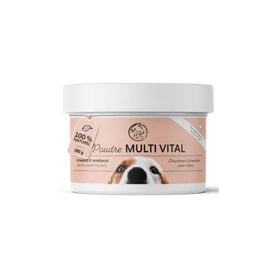 APPORT EN VITAMINES : La poudre Multi Vital donne à votre chien le pouvoir vitaminique dont il a besoin pour rester en bonne santé et joyeux. INGRÉDIENTS DE HAUTE QUALITÉ : Les matières premières telles que l'herbe d'orge, la spiruline et l'églantier fournissent des vitamines B, C et des minéraux importants. Des acides gras oméga-3 sont également contenus dans la poudre. MOINS C'EST PLUS : Nous nous limitons toujours à quelques ingrédients particulièrement de haute qualité et à haute biodisponibilité. BASÉ SCIENTIFIQUEMENT : Des vétérinaires et des scientifiques ont été impliqués dans le développement de la poudre Multi Vital. Des analyses complémentaires vous informent sur les vitamines, les minéraux et les acides gras oméga-3 qu'il contient. EXPÉDITION NEUTRE EN CO² : Nous protégeons notre nature et votre portefeuille. Vous pouvez commander chez nous avec la livraison gratuite et en même temps contribuer à la durabilité car nous compensons nos émissions de CO².Composition