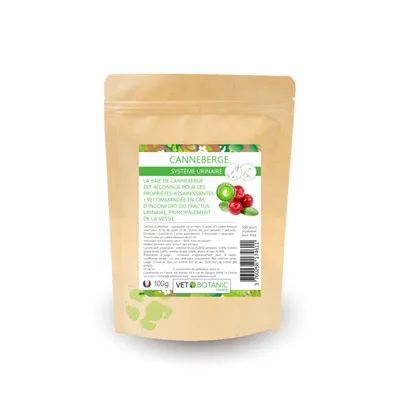 Les baies de canneberge, source de flavonoïdes, possèdent des vertus purifiantes. CANNEBERGE – Vaccinium macrocarpon Aiton. Famille des Éricacées Composants : glucides (dont fibres alimentaires et sucres), potassium, fer, vitamine C, manganèse La canneberge est bénéfique pour le tractus urinaire du chat et du chien. En effet, grâce à sa richesse en antioxydants, elle possède des propriétés purifiantes pour le système urinaire. Sa teneur en vitamine C, en zinc et en magnésium aide à contrer les radicaux libres qui entrainent le vieillissement de l’organisme. Le bon conseil : Dès les premiers signes, nous vous conseillons de mélanger la canneberge avec de l'échinacée, pour soutenir l'immunité et de bien faire attention à toujours avoir de l’eau à disponibilité. Sachet kraft 100gAvantages du produit