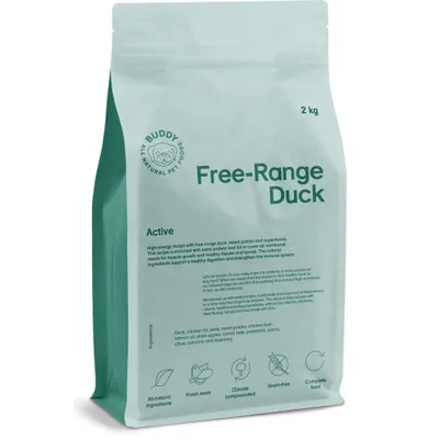 Découvrez BUDDY Free-Range Duck 2 kg, l'aliment complet et équilibré spécialement formulé pour les chiens actifs et les grandes races. Ce régime riche en énergie est élaboré à partir de canard frais, de patate douce et de superaliments, offrant une nutrition optimale. Les protéines et graisses supplémentaires favorisent une croissance musculaire saine, ainsi que des os et des tissus robustes. Grâce à des ingrédients naturels, il contribue à une digestion saine et renforce le système immunitaire de votre compagnon. Les croquettes, de forme ronde et plate (environ 1,2-1,6 cm), sont sans additifs artificiels, sans céréales et sans gluten, garantissant une alimentation pure et bénéfique.