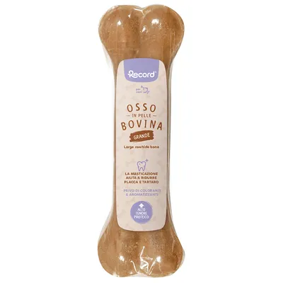 Grand os à mâcher Record en peau de vache 100% naturelle, traité thermiquement et séché lentement pour préserver goût et texture. Fabriqué à la main, il offre une longue durée de mastication adaptée aux chiens de taille moyenne à grande (14 cm, 85 g). Stimule la mastication, aide à maintenir l'hygiène bucco-dentaire et occupe le chien pour réduire le stress et l'ennui. Aliment complémentaire sans additifs artificiels. Origine : Italie.Avantages du produit