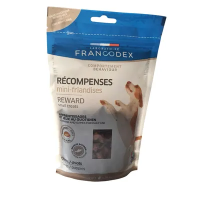 - Sans colorant et sans sucre ajouté, les MINI FRIANDISES RECOMPENSES FRANCODEX accompagnent les jeux et toutes les périodes d'éducation de votre chien, comme l'apprentissage des manipulations nécessaires aux soins, et l'entrainement médical.
