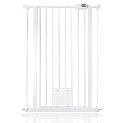 Barrière de sécurité Bettacare pour chat avec trappe verrouillable - montage par pression, simple à installer et à retirer. Compatible avec largeurs de 68,5 cm à 147,4 cm avec extensions, disponible en blanc, gris ardoise et noir mat. Hauteur totale 104 cm, matériaux métalliques durables, bords lisses et arrondis pour réduire les risques de blessure. Trappe pour chat 18 x 16 cm avec mécanisme manuel, ouverture bidirectionnelle et option de verrouillage simple ou double pour plus de sécurité. Fonctionnement à une main et fermeture intuitive, adaptée à portes et escaliers de différentes tailles. Non certifiée pour une utilisation en présence d’enfants, à utiliser exclusivement pour la protection des animaux.Avantages du produit