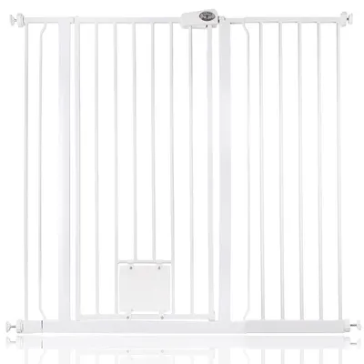 Barrière de sécurité Bettacare pour chat avec trappe verrouillable - montage par pression, simple à installer et à retirer. Compatible avec largeurs de 68,5 cm à 147,4 cm avec extensions, disponible en blanc, gris ardoise et noir mat. Hauteur totale 104 cm, matériaux métalliques durables, bords lisses et arrondis pour réduire les risques de blessure. Trappe pour chat 18 x 16 cm avec mécanisme manuel, ouverture bidirectionnelle et option de verrouillage simple ou double pour plus de sécurité. Fonctionnement à une main et fermeture intuitive, adaptée à portes et escaliers de différentes tailles. Non certifiée pour une utilisation en présence d’enfants, à utiliser exclusivement pour la protection des animaux.Avantages du produit