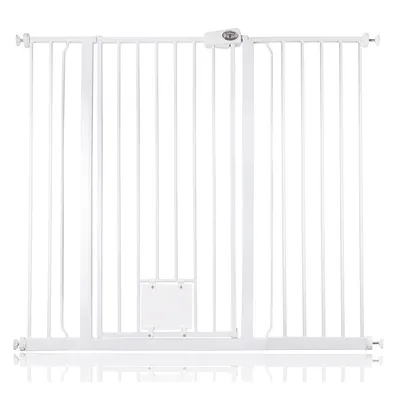 Barrière de sécurité Bettacare pour chat avec trappe verrouillable - montage par pression, simple à installer et à retirer. Compatible avec largeurs de 68,5 cm à 147,4 cm avec extensions, disponible en blanc, gris ardoise et noir mat. Hauteur totale 104 cm, matériaux métalliques durables, bords lisses et arrondis pour réduire les risques de blessure. Trappe pour chat 18 x 16 cm avec mécanisme manuel, ouverture bidirectionnelle et option de verrouillage simple ou double pour plus de sécurité. Fonctionnement à une main et fermeture intuitive, adaptée à portes et escaliers de différentes tailles. Non certifiée pour une utilisation en présence d’enfants, à utiliser exclusivement pour la protection des animaux.Avantages du produit