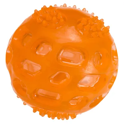 • Jouet dentaire pour chiens en caoutchouc thermoplastique résistant, en forme de boule. S'il est mordu ou pressé, il émet un son joyeux, stimulant l'intérêt de l'animal.