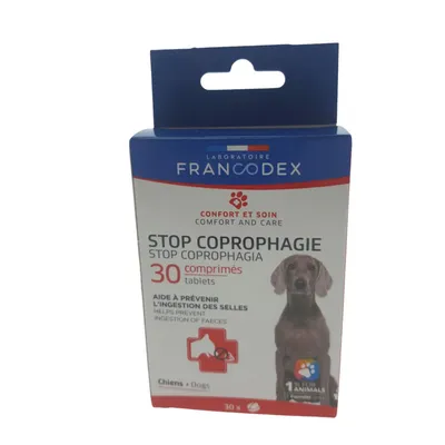 - Les comprimés STOP COPROPHAGIE FRANCODEX donnent aux selles de votre chien une odeur et un goût pimentés, ce qui en réduit l'appétence.