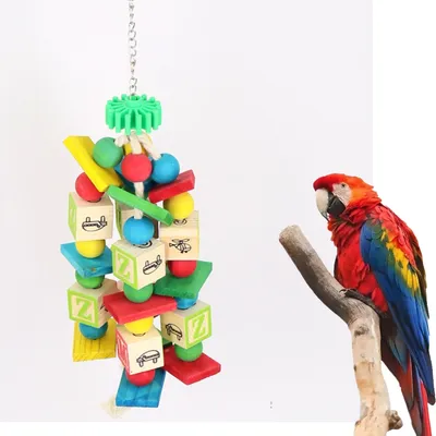 • Taillage du bec : Le bec d'un perroquet croît constamment pour rester tranchant. Si le bec est trop long, cela peut gêner son alimentation et nuire à sa santé. Nos jouets à mâcher contiennent divers accessoires tels que des balles colorées et des blocs cubes qui inciteront votre perroquet à mâcher et aideront à tailler son bec.