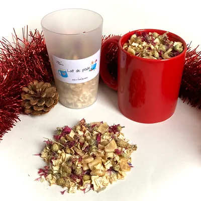 • Chocolat chaud : Granulés de foin de fléole, céleri rave et une racine de pissenlit